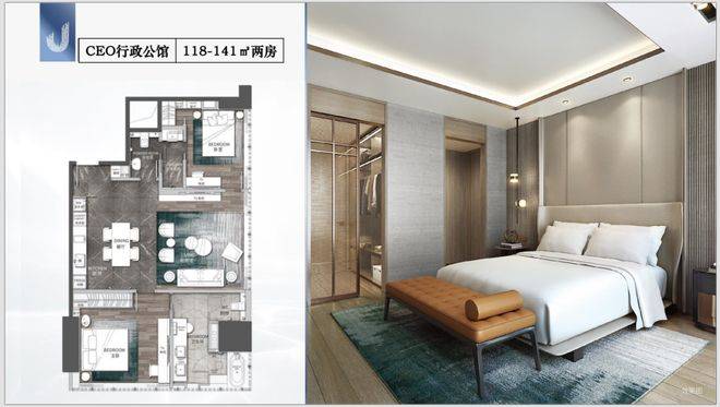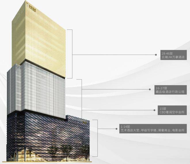 建筑功能分区清晰:1到14层规划甲级写字楼、精奢商业和高端影视会所,15层是专属高端私人酒店会所,16到27层才是J公馆行政公馆主体,28层以上至46层为JW万豪酒店。这种设计让居住部分既保持私密,又能无缝借力酒店资源,业主足不出户就能享受五星级标准的服务与配套。
